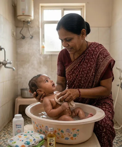 Traditional post-natal care for the new mother and newborn, including massages, bathing, and specialized diet management.